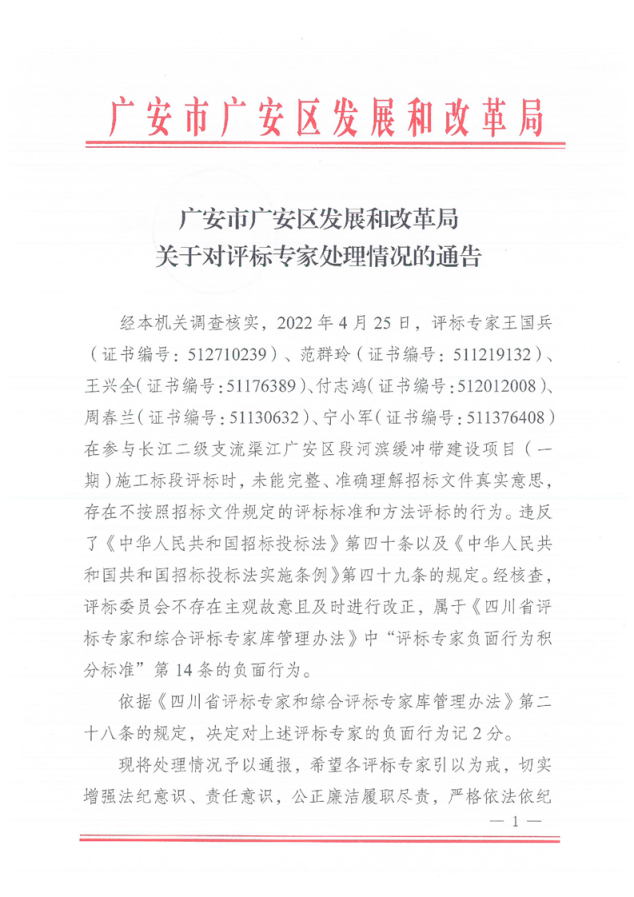 广安市广安区发展和改革局关于对王国兵、范群玲、王兴全等5名评标专家处理情况的通告