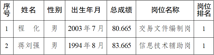 根据《广安市公共资源交易中心2025年招聘非在编工作人员公告》有关规定,经公开报名、笔试、面试、体检、考察等程序,现将拟聘用人员公示如下。