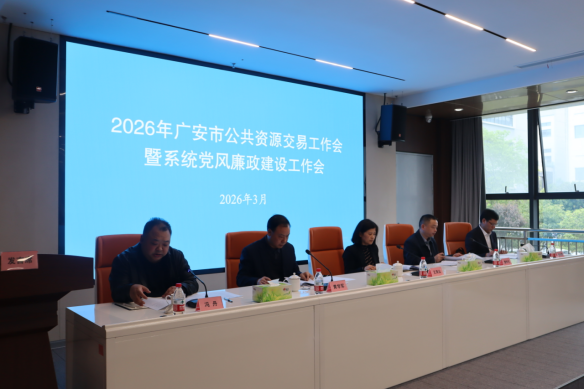 3月27日,2026年广安市公共资源交易工作会暨系统党风廉政建设工作会在广安召开。市公共资源交易中心领导班子成员、市纪委监委驻市政府办公室纪检监察组组长唐和东、各县(市、区)分中心相关负责同志、市公共资源交易中心全体在编干部职工参加会议。会议由市公共资源交易中心党组成员、副主任黄学军主持。